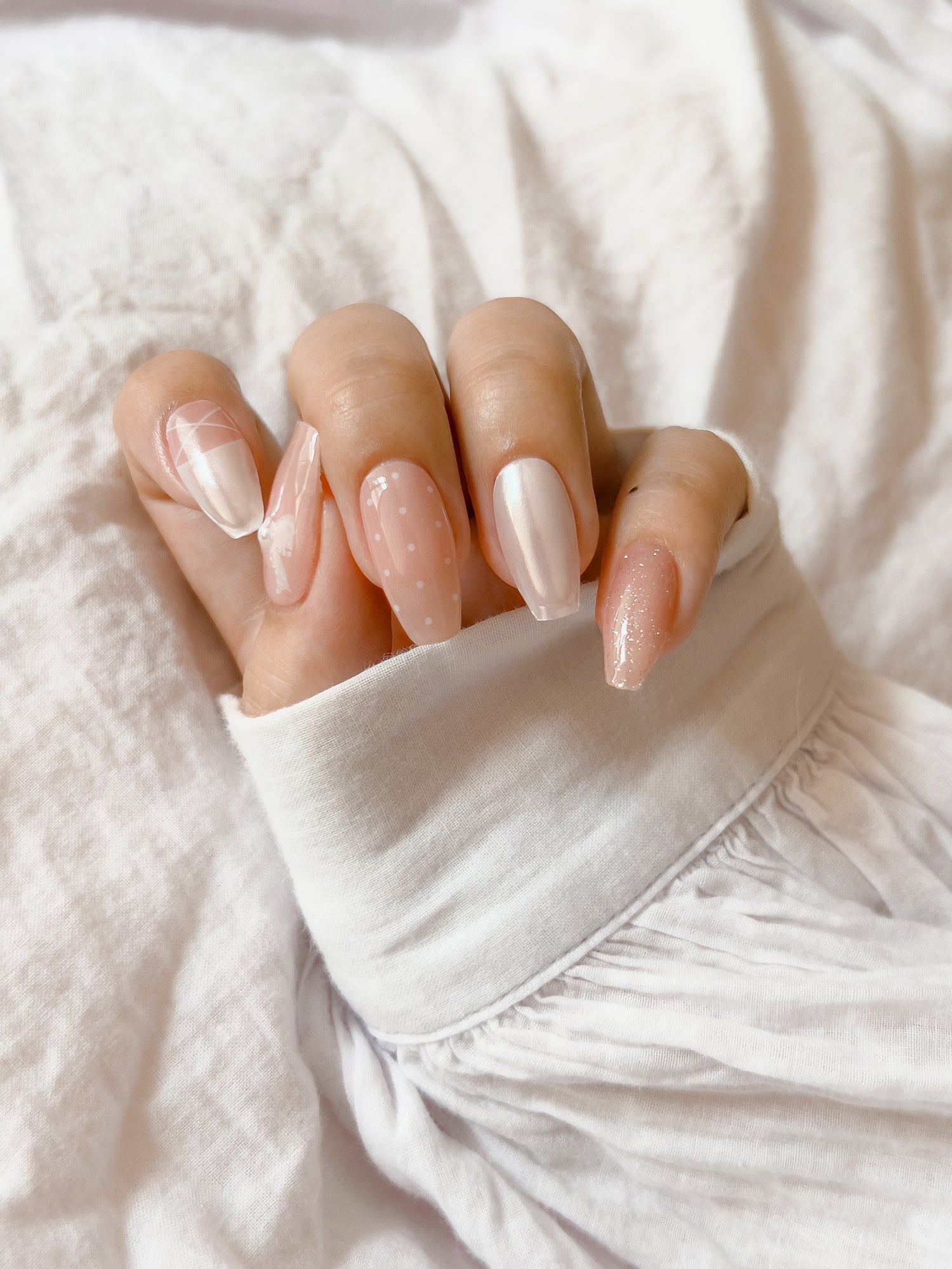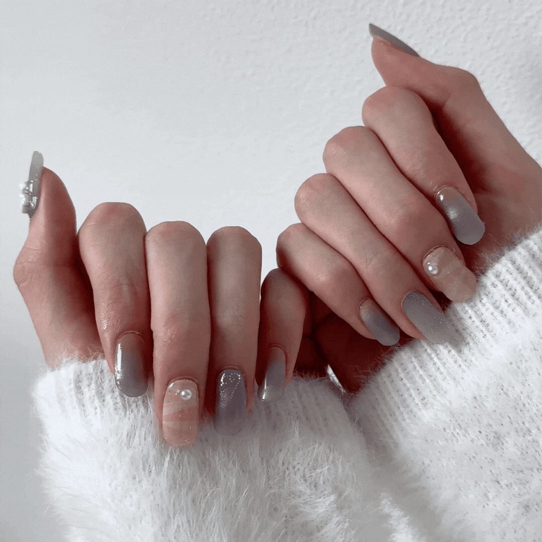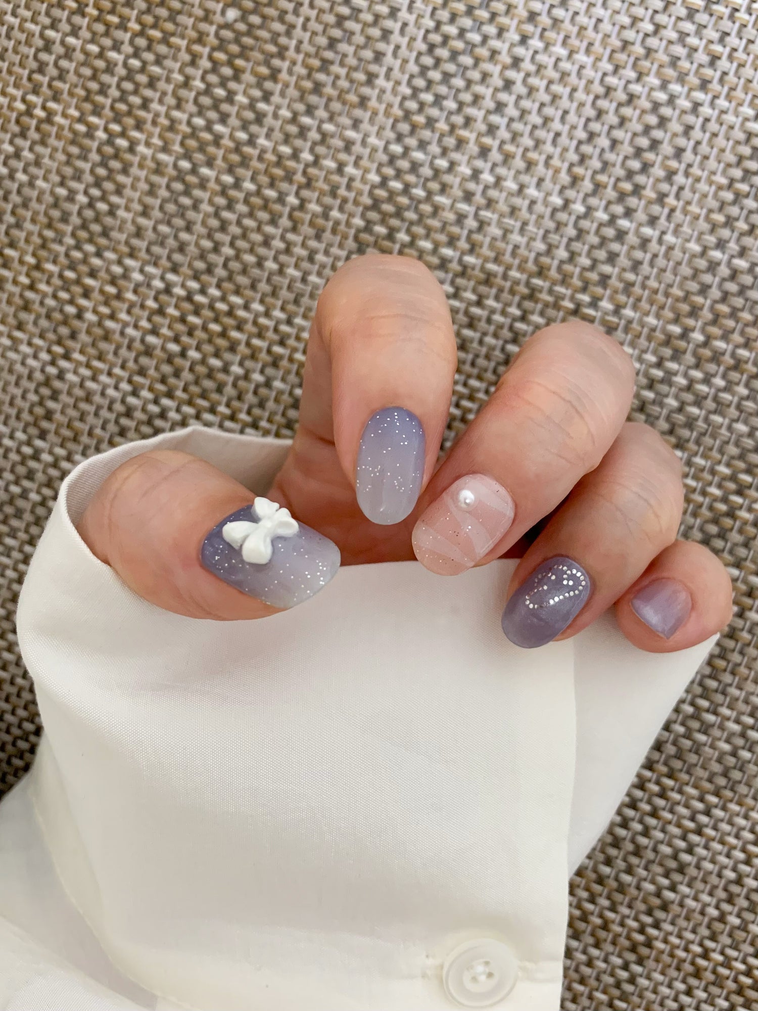 銀絲配閃粉令人著迷,白色的漸層色完美無瑕。 小珍珠增添了可愛的感覺。可以keep 到兩個禮拜,幾乎沒有任何碎裂 - 太棒了! ✨ 當然是最近最愛既指甲!